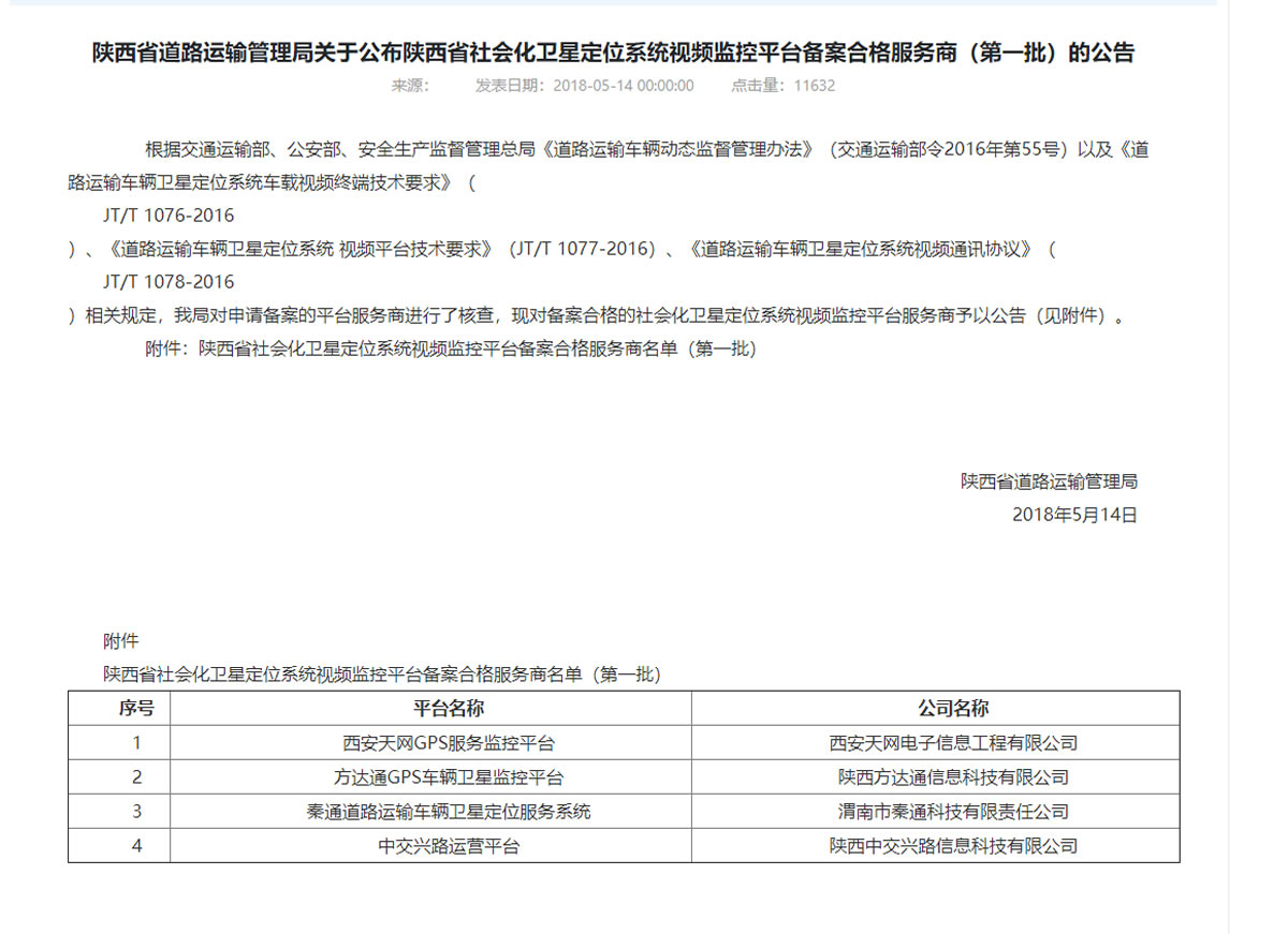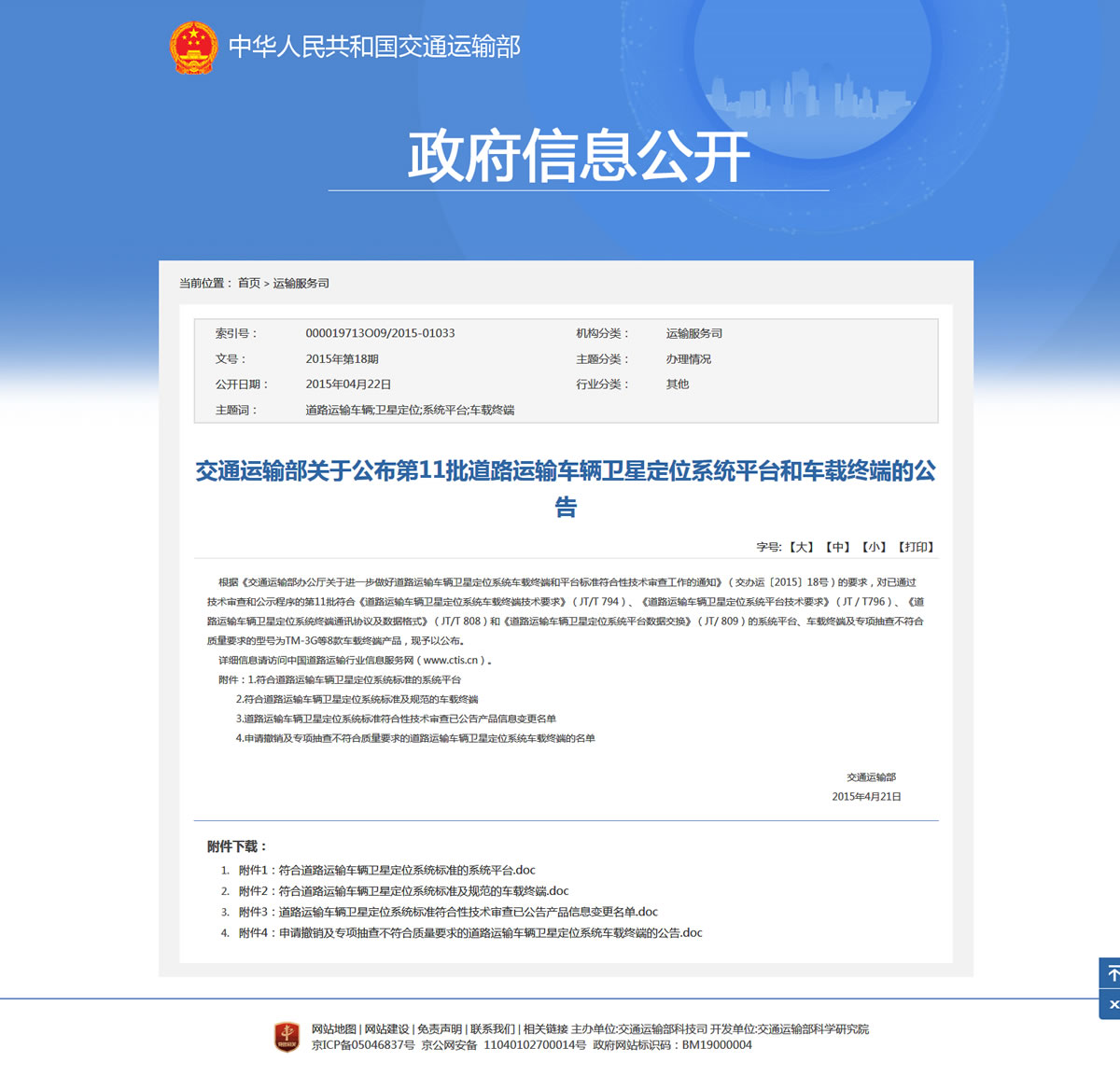 全国交通运输部关于公布第11批道路运输车辆卫星定位系统平台和车载终端的公告-政府信息公开-交通运输部